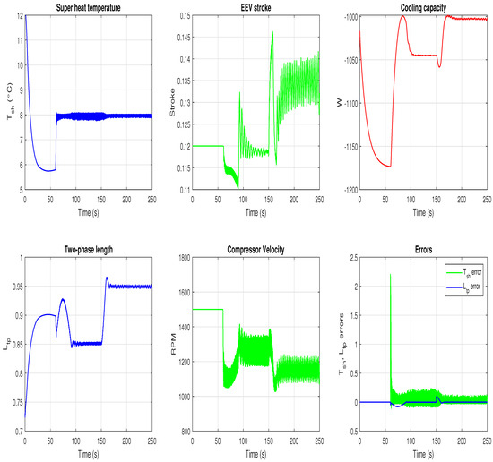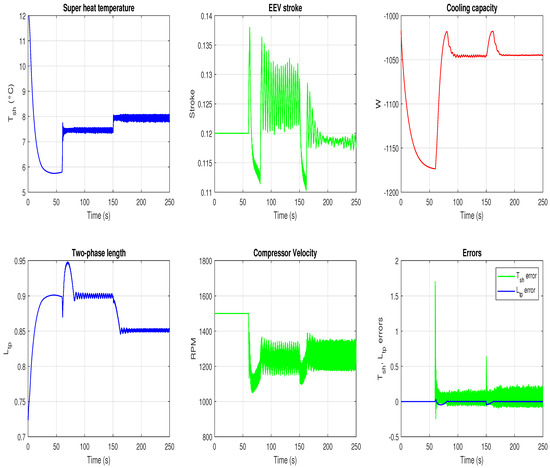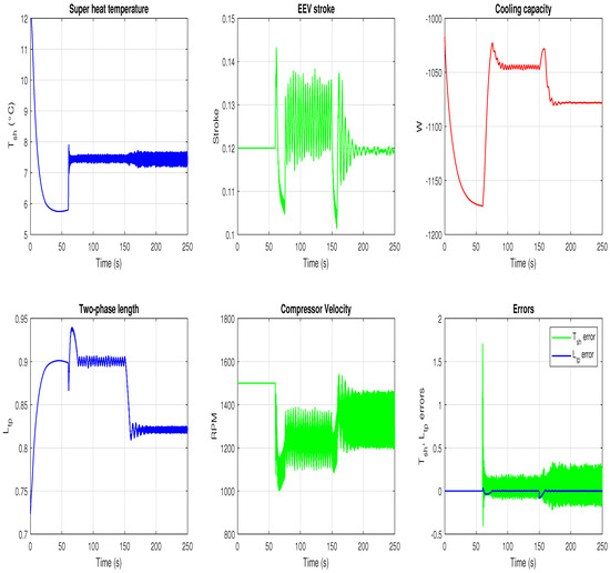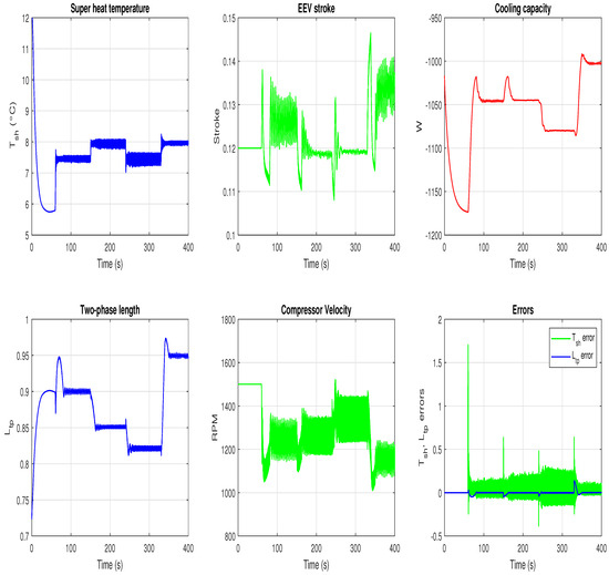 Additionally, some operating conditions were selected to steer the system towards operation regions of good efficiency concerning the contour maps presented in Section 4. Figure 6 shows a change in both, two-phase length and superheat temperature which change from and , respectively, and 8 while preserving the cooling capacity, in order to highlight the possibility of different selections for those variables leading to the same cooling capacity. Each one of the Figure 6, Figure 7, Figure 8 and Figure 9 contain six plots corresponding to: The two control inputs, the two controlled outputs, the cooling capacity, and the last one for the output errors.