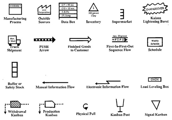 Value Stream Mapping (VSM) uses a set of universal symbols to graphically represent production processes, providing a common language for value stream analysis and a deeper understanding of the connections in the flow of materials. Symbols adapted from the approach in [22] will be used as they are shown in Figure 1.