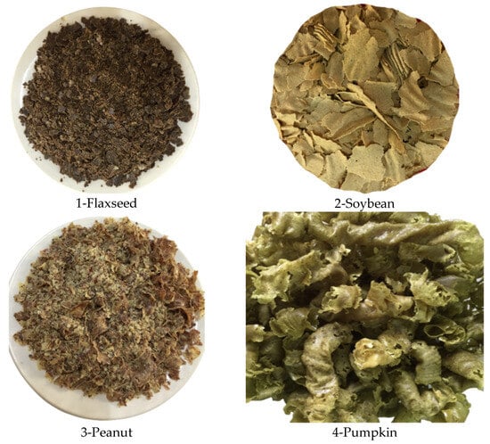 Samples of oil cake were obtained from the experimental department for the production of vegetable oils at the Seifullin Kazakh Agrotechnical Research University (Astana, Kazakhstan). Seeds of soybean, pumpkin, sunflower, peanut, and flax of the 2023 crop year were dried and pressed on a screw oil press. The secondary product of oilseed processing is oil cake, which is mainly used as animal feed.