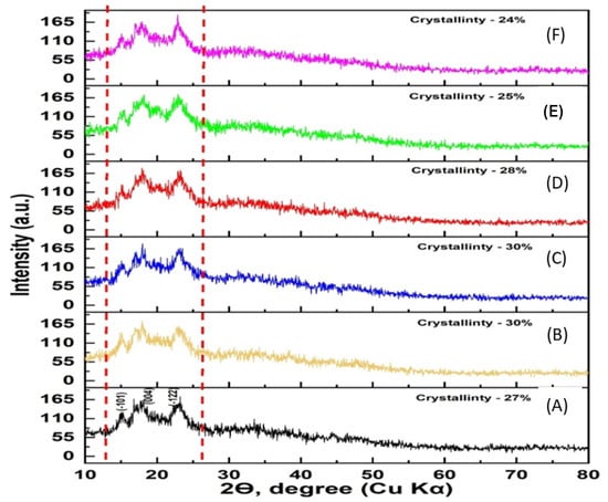 X-ray diffraction (XRD) was performed on an XPERT-PRO PANANALYTICAL diffractometer (PANalytical Company, Almelo, The Netherlands), at room temperature with a copper anti-cathode operating at 40 kV and a 30 mA current, to check whether the structure of the samples was crystalline or amorphous. Diffraction was performed on energized samples spread smoothly on a neutral quartz glass sample holder, exposed to a k-alpha radiation source and scanned between 15° and 100° at 2 theta angles [19].
