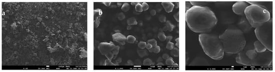 The sample is a powder that consists of two ensembles of particles: large (up to 0.6 mm) and small—with sizes from 4 to 16 microns. The large particles have signs of a brittle fracture in the form of smooth surfaces and even edges. At the same time, the small particles have a smoothed surface and are often agglomerated. The fine structure of the small particles is characterized by the presence of finer (around 3 microns) particles linked together (Figure 6).