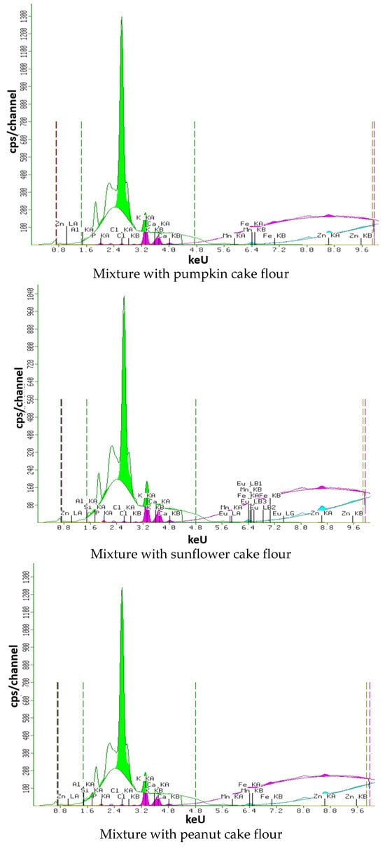 The structural characteristics and chemical composition of gluten-free mixtures with the addition of oilseed cake flour depend on the quality of the oilseeds, methods and modes of preparation for pressing, pressing method and equipment, as well as microstructure. Figure 2 shows the result of the X-ray fluorescence analysis of the composition of gluten-free mixtures with the addition of oilseed cake flour.