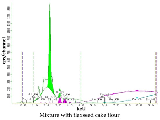As can be seen from Table 7, the gluten-free mixtures with the addition of oilseed meal exceed the control sample in terms of the content of potassium, calcium, silicon, manganese, and zinc. Thus, soy flour has the highest content of potassium (1.017%) and iron (0.033%) compared to 0.527% and 0.029%, respectively. In flaxseed flour, the calcium content is 0.53%, which is almost twice as high as the control. The presence of aluminum is due to the presence of rice flour in the mixture.