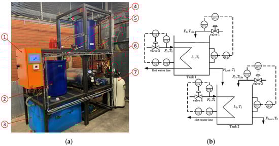 The component descriptions of the heated two-tank process as shown in Figure 1a are summarised in Table 1. The process is controlled via a Siemens S7 Programmable Logic Controller (PLC) and supervised via a Human–Machine Interface (HMI). An Ethernet network connects the PLC to a standalone computer. Siemens’ Totally Integrated Automation Portal software is used to log process data at one-second intervals.