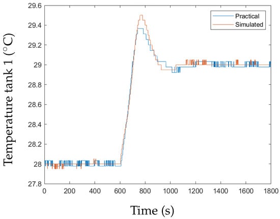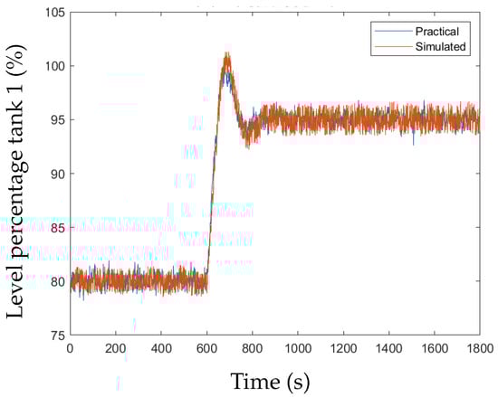 To evaluate how the simulated data compare to the practical data, the transient response of the practical system is compared to that of the model across all measured variables. Figure 2 and Figure 3 illustrate how the practical data compared to simulated data for the level and temperature transients in Tank 1, respectively. The Simulink® model measured process variables, namely, the levels of the tanks and the temperatures in the tanks were altered to be representative of the actual measured process variables. For the levels of the tanks, the implementation translated to multiplying the level percentage with a uniform random number between 0.98 and 1.02. For the temperature, a pulse generator was used in the Simulink® model with the same resolution of the temperature sensor, i.e., 0.1 °C. The discrete nature of the temperature response is due to the resolution of the temperature sensors of 0.1 °C.