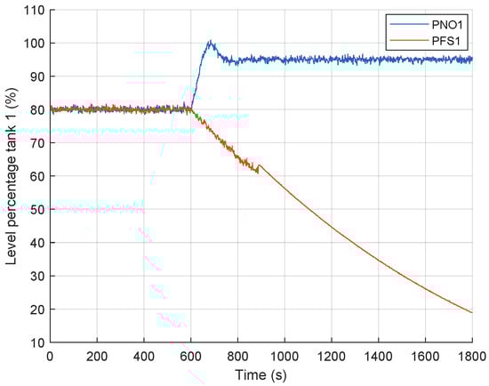 Figure 4 illustrates the practical level in Tank 1 for both a normal transient (PNO1) and a transient under a stuck valve fault condition (PFS1). The fault and the transient are simultaneously introduced at time instant 600 s.