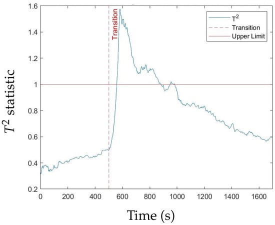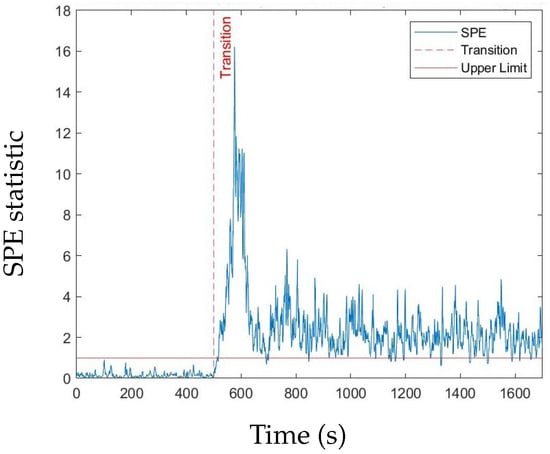 Two multivariate control charts can be employed to monitor the system. The detection of a system fault is triggered if the values of the squared prediction error (SPE) and Hotelling’s statistic exceed the calculated fixed threshold [8]. To streamline both control charts, the upper control limit threshold can be set to a unitary value of 1, and then the statistics are normalised for the transients.