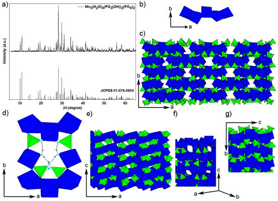 (a) XRD of Mn5(H2O)4(PO3OH)2(PO4)2. (b) Mn5O22 units. (c) Crystalline structure of Mn5(H2O)4(PO3OH)2(PO4)2. (d) Open structure of the channel (pocket) showing hydrogen bonding with water molecules and PO3-OH groups. (e–g) Tunnels in the crystalline structure of Mn5(H2O)4(PO3OH)2(PO4)2 across different axes.