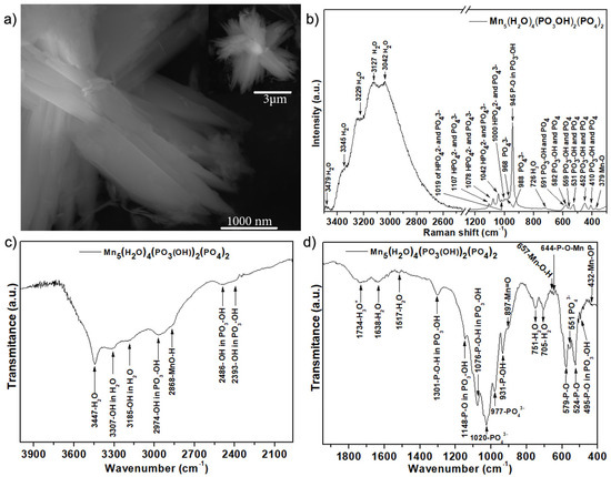 (a) SEM image of Mn5(H2O)4(PO3OH)2(PO4)2. (b) RAMAN spectrum. (c,d) FTIR spectrum of Mn5(H2O)4(PO3OH)2(PO4)2.