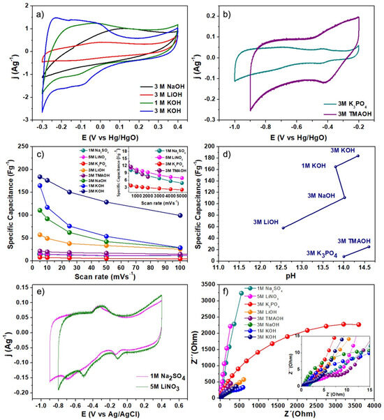 Cyclic voltammograms of Mn5(H2O)4(PO3OH)2(PO4)2 at 5 mVs−1 in (a) 3M KOH, 1M KOH, 3M NaOH, and 3M LiOH. (b) Cyclic voltammogram of Mn5(H2O)4(PO3OH)2(PO4)2 at 5 mVs−1 in 3M K3PO4 and 3M TMAOH. (c) Specific capacitance of Mn5(H2O)4(PO3OH)2(PO4)2 in different electrolytes as a function of the scan rate. (d) Specific capacitance of Mn5(H2O)4(PO3OH)2(PO4)2 at 5 mVs−1 in different electrolytes as a function of pH. (e) Cyclic voltammogram of Mn5(H2O)4(PO3OH)2(PO4)2 at 5 mVs−1 in 5M LiNO3 and 1M Na2SO4. (f) EIS spectra of Mn5(H2O)4(PO3OH)2(PO4)2 in different electrolytes.