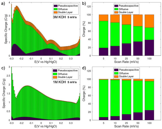 In 3M KOH at the scan rate of 5 mVs−1, the charge that arises from a diffusive process (Figure 4a), which in this case is the intercalation of electrolyte ions into the pocket, dominates the charge storage process in all the applied potential. Figure 4b shows the percentage of the charge that arises from the three different processes. It is worth mentioning that even at the high scan rate of 100 mVs−1, around 30 percent of the charge arises from an intercalation process. This is also the case for vanadium phosphates reported in previous work [14]. The charge from the pseudocapacitive process increases with the scan rate (see Figure S5) and can be as high as 40 percent (Figure 4b). The lowest contribution to the charge is from the electric double layer. When 1M KOH was used, the intercalation process was also the main charge storage process across all the applied potential. However, the signature of the plot is different, and the electric double layer is lower than in the previous case. The charge percentage that arises from an intercalation process increases from 65 percent in 3M KOH to 94 percent in 1M KOH at the scan rate of 5 mVs−1. This evidences that the pH and concentration affect the charge storage mechanism. In 1M KOH, both the electric double layer and pseudocapacitive contributions increase with the scan rate (see Figure S6).
