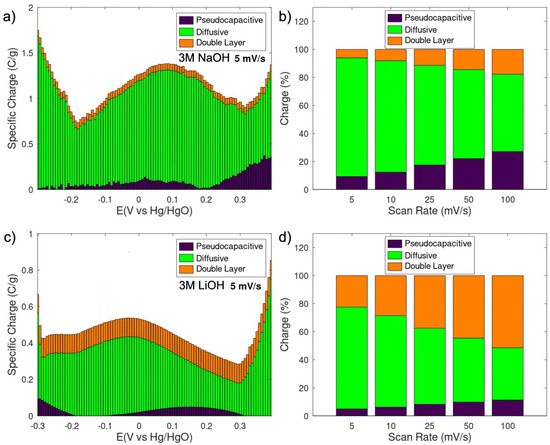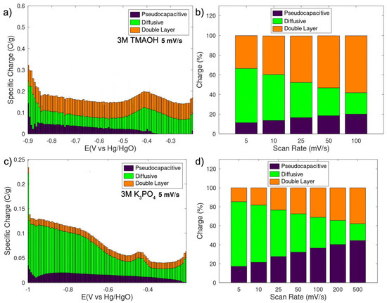 Interestingly, in 3M TMAOH and 3M K3PO4, the deconvoluted cyclic voltammograms show that the main contribution to the stored charge at low scan rates of 5 mVs−1 is the intercalation process in all the applied potential (see Figure 6a,c). At higher scan rates (>50 mVs−1), the electric double-layer capacitance and the pseudocapacitive process are the main charge storage processes (see Figure 6b,d).