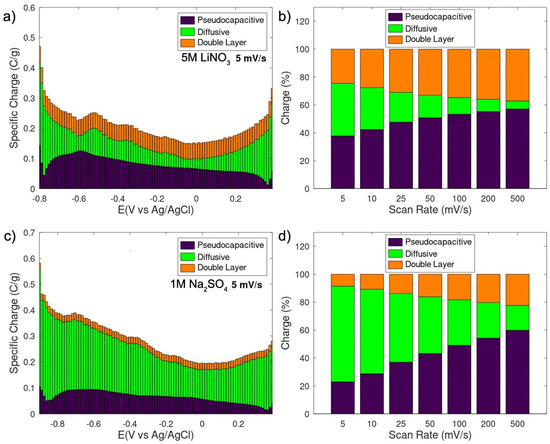 In neutral electrolytes, the amount of stored charge is lower than in 3M KOH and in the same range of 3M K3PO4. The deconvoluted charge plots in 5M LiNO3 (see Figure 7a) indicate that the intercalation and pseudocapacitive process takes place across the potential window, and they are around 38 percent of the charge at 5 mVs−1. As the scan rate increases, the pseudocapacitive process becomes dominant up to 58 percent (Figure 7b). The deconvoluted charge vs. applied potential at different scan rates can be observed in Figure S11. The intercalation (diffusion) process becomes less important at high scan rates and the electric double layer and pseudocapacitive process are the main mechanisms of stored charge. In the case of 1M Na2SO4, the intercalation process is observed in all the applied potential window (see Figure 7c) and is as high as 70 percent of the stored charge at 5 mVs−1 (see Figure 7d). It is important to notice that the contribution to the electric double layer becomes less important in 1M Na2SO4 than in 5M LiNO3 at any scan rate (see Figure 7d and Figure S12). In both neutral electrolytes the pseudocapacitive process becomes dominant at higher scan rates and is as high as 58 percent at the scan rate of 500 mVs−1 (see Figure 7c,d). However, the intercalation process is larger in 1M Na2SO4, at any scan rate, than in 5M LiNO3. The above suggests that a Na+ hydrated ion size smaller than that of Li+ promotes the intercalation. Thus, for an intercalation process into the pocket in neutral pH, the hydrated ion size of cations is more important. In contrast, the contribution of neutral anions to the intercalation process is hindered by their lack of reactivity with the free-O-H acid group in PO3(OH) tetrahedra. Overall, neutral electrolytes induce a lower amount of stored charge than alkaline electrolytes due to their low reactivity with the O-H acid group located in the pocket. Hence, the stored charge mainly depends on the low specific surface area of Mn5(H2O)4(PO3OH)2(PO4)2 that leads to a lower specific capacitance than in alkaline electrolytes.