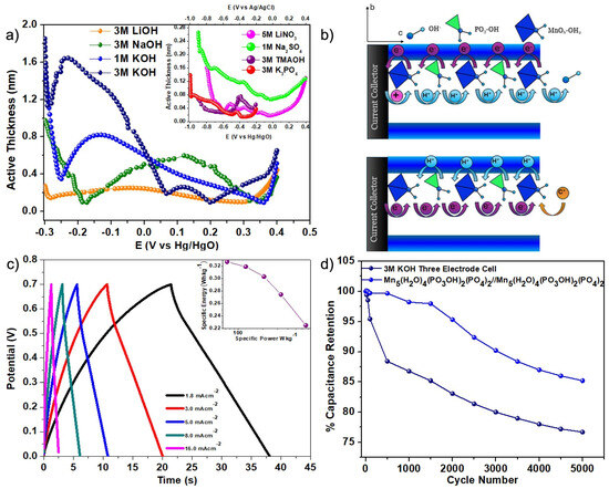 (a) Active thickness in different electrolytes. (b) Scheme of the proposed mechanism. (c) Constant charge–discharge plots of Mn5(H2O)4(PO3OH)2(PO4)2 Swagelok-type device; the inset shows the Ragone plot. (d) Percentage of capacitance retention in a three-electrode cell and a two-electrode Swagelok-type cell.