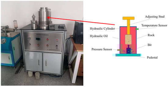 The test utilizes a high-temperature and high-pressure fully automatic rock drillability tester to measure rock drillability. A schematic diagram of the test equipment structure is shown in Figure 1. The equipment includes a temperature control module, a hydraulic control module, a core clamping module, and a data acquisition module. The temperature control range is from 0 to 200 °C, and the confining pressure control range is from 0 to 100 MPa. Unlike conventional simulated drillability tests where the bit drills downwards, this experimental setup uses an upward drilling method. This facilitates the removal of rock cuttings, which are collected in a rock cuttings collection bucket at the bottom of the bit.