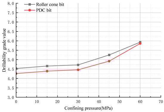 According to the data in Table 4: (1) When the temperature is fixed at 120 °C, with the increase in confining pressure, the drillability grades of the roller cone bit and PDC bit obtained through finite element simulation both increase. The drillability grades of the roller cone bit range between 5 and 7, and those of the PDC bit range between 4 and 7. (2) When the confining pressure is fixed at 30 MPa, with the increase in temperature, the drillability grades of the roller cone bit and PDC bit obtained through finite element simulation both increase. The drillability grades of the roller cone bit range between 4 and 6, and those of the PDC bit range between 4 and 5.