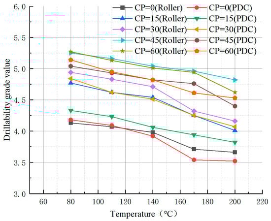 Figure 4 illustrates the analysis results of rock drillability levels under coupled effects of confining pressure (CP) and temperature. Under coupled temperature and confining pressure conditions, the graph indicates that confining pressure has a greater impact on rock drillability compared to temperature. When the temperature exceeds 140 °C, the difference in drillability levels compared to the single factor of confining pressure becomes significant. Therefore, when the temperature is below the critical temperature, consideration of coupled temperature and pressure conditions may not be necessary; instead, only the influence of confining pressure on drillability needs to be considered. However, when the temperature exceeds the critical temperature, the combined effects of temperature and confining pressure on drillability must be taken into account.