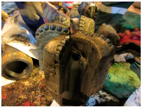 Based on the above analysis, it was found that the drilling capability values of the roller cone bit and PDC bit at this layer of the Permian system range between 40 and 46. Additionally, the drilling capability value of the PDC bit is lower than that of the roller cone bit. To improve drilling efficiency and reduce drilling costs, it is recommended to use the PDC bit. The PDC bit after drilling out of the well is shown in Figure 8. This bit successfully drilled through the target formation using only 9 bits, achieving a mechanical drilling speed of 2.38 m/h, thus achieving the expected drilling results.