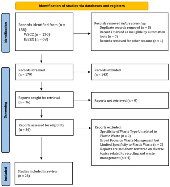 Two articles were excluded during the second screening analysis, which involved the complete article screening process, due to their lack of specificity of waste type unrelated to PW [13,14]. Another two were excluded because despite having a broad Focus on WM, they had a limited specificity to plastic WM [15,16]. Finally, four were excluded because the reports were scattered on diverse topics related to recycling and WM [17,18,19,20]. The selection process resulted in a total of 28 articles that were included in the systematic review [5,15,21,22,23,24,25,26,27,28,29,30,31,32,33,34,35,36,37,38,39,40,41,42,43,44,45,46].