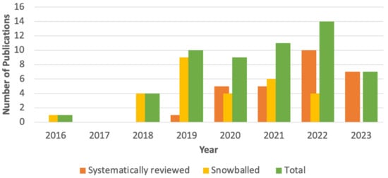 Published articles by year, indicating the number of systematically reviewed articles, snowballed articles, and the total.