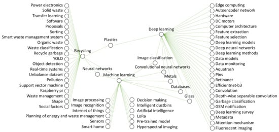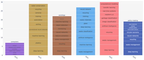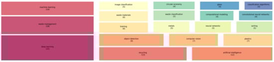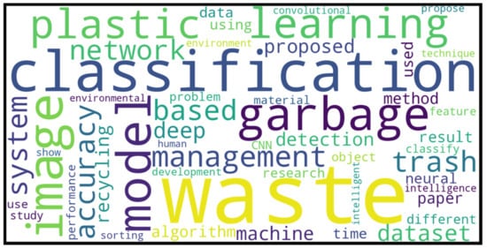 The five most common general keywords in the examined articles (from most to least common), produced using the pyBibX library (algorithmically generated keywords) on title and abstract, were deep learning, waste management, machine learning, recycling, and artificial intelligence. The frequency of these most common keywords is presented in Figure 3. We can see the top ten general keywords per year of publication in Figure 4, where the prevalence of “deep learning” after 2019 is apparent, along with the emergence of keywords “Computers” in 2016, “sociology” in 2020, and “policy-making” in 2023 reflecting the evolving focus and interdisciplinary nature of research over the years. The graph presented in Figure 5 was produced by adjacency analysis of the general keywords. It is highly relevant to note that “deep learning” and “recycling” (the two nodes with more links) are related to “plastics”. Furthermore, “machine learning” is the third node with more links and is associated with “recycling” directly or through “neural networks”, while the link to “deep learning” by “image classification” and “convolutional neural networks”. The ten most prevalent words (with four or more characters) in the abstract of the examined articles, presented in Figure 6, were (from most to least common) “waste”, “classification”, “image”, “model”, “garbage”, “learning”, “plastic”, “management”, “trash”, and “accuracy”. The most common N-grams with two words were (from most to least common) “deep learning”, “waste management”, “machine learning”, and “artificial intelligence”. From these results, it is possible to conclude that the selected articles are indeed aligned with the scope of the review.