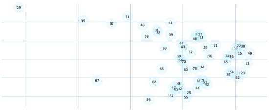 Document projection of the reviewed articles based on the abstract words. The numbers are the reference of the articles.