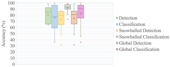Considering the classification accuracy of the systematically reviewed article, it is apparent in Figure 8 that the classification accuracy boxplot displays a wide range of model performance, with the lowest accuracy recorded at 36% [42]. This suggests that some models may struggle with complex detection when considering four classes. There are no minimum outliers, which indicates a consistent performance floor across all models studied. The middle 50% of data points are delineated by the first quartile (Q1, 25th percentile) at 59.24% and the third quartile (Q3, 75th percentile) at 96.28%. This signifies a noteworthy improvement in model performance within this interquartile range, from moderately performing models to those achieving high accuracy. The median accuracy is 77.34%, slightly exceeding the average accuracy (75.36%); thus, the results are reasonably well distributed. The maximum accuracy recorded was 99.60% [38], demonstrating the potential of state-of-the-art models to achieve near-perfect detection in controlled conditions or specific applications. Curiously, the snowballed articles exhibit a much shorter variation, with an outlier at 73.20% [59]. Q1 is 89.80%, and Q3 is 97.11%, with a median of 93.32%. Therefore, in the global classification, reference [42]’s performance is now an outlier; Q1 is 75.40%, and Q3 is 96.33%, with a median of 91.08%.