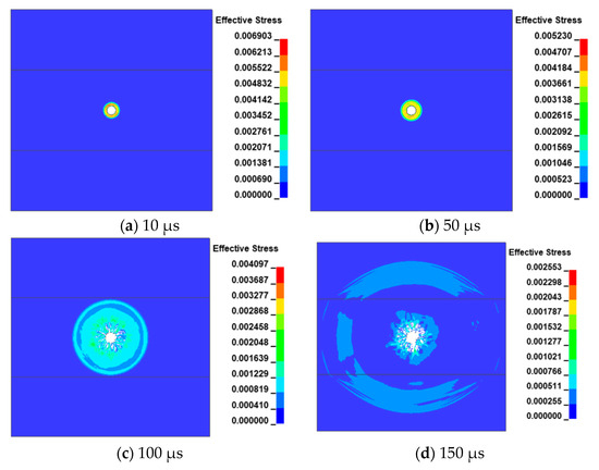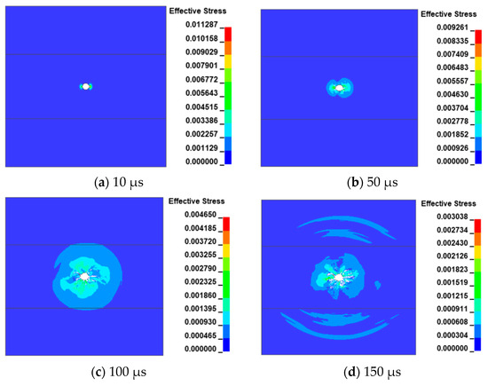 Using the LS-Pre Post post-processing software to read the d3plot header file of the model and analyze the simulation results. Utilizing the post-processing software Fcomp to demonstrate the evolution process of effective stress near the blasting hole during the initial stage of blasting. The cloud diagrams of effective stress at different time points for two sets of models are shown in Figure 2 and Figure 3.