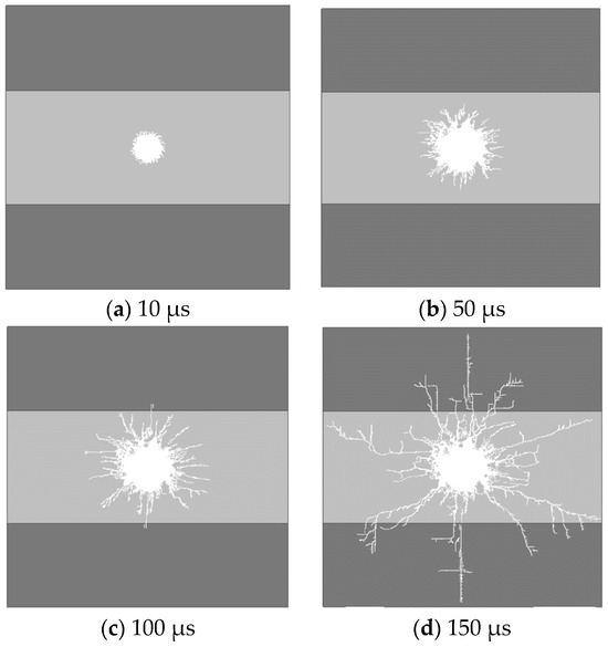 Previously, we discussed the different stress cloud diagrams near the blasting hole due to different shaped charge structures during the blasting process. Through post-processing software, the development and expansion process of fractures within the model can be further displayed, as shown in Figure 4 and Figure 5.