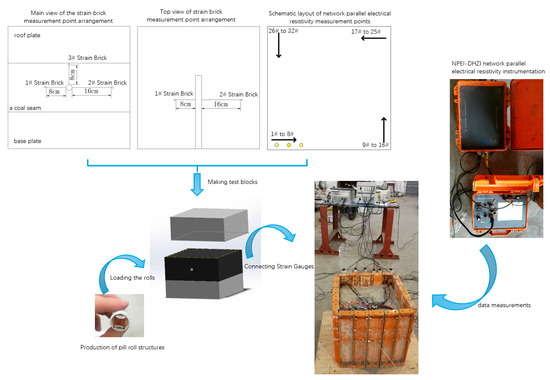 In order to investigate the permeability enhancement effect after blasting with different shaped charge structures, a similar simulation experiment on blasting-induced permeability enhancement was conducted. The experiment simulated a coal-rock formation at a certain location in the Pansan Mine, Anhui Province. After determining the similar materials and proportions, an experimental platform was constructed, with the overall design scheme shown in Figure 6. Firstly, the positions of strain collection points, parallel electrical method measurement points, and shaped charge structures were designed. Secondly, test blocks were fabricated according to the design scheme. Finally, blasting experiments were conducted, and data were collected. Before both blasting models completed the blasting tests, the NPEI-DHZI network parallel electrical resistivity instrumentation was used to conduct data measurements on the models after blasting.