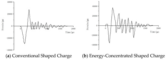 At Point 1 of the two similar model test blocks, a comparison between Figure 7a,b reveals that before 400 μs is the dynamic loading phase of the blasting. During this phase, the coal body is mainly affected by the explosion stress wave, resulting in drastic changes in stress values. Both simulated test blocks showed two stress peaks during this phase. In the simulated test block filled with conventional shaped charges, the strain peak at Point 1 was −29,693 με, while in the simulated test block filled with directional energy-concentrated shaped charges, the strain peak at Point 1 was −36,230 με. It can be calculated that the strain peak in the horizontal energy-concentrating direction using directional energy-concentrated shaped charges is approximately 1.22 times that of conventional shaped charges. During the static loading phase, the coal body is mainly affected by the detonation gases, resulting in a smaller range of strain changes that gradually attenuate over time. In Figure 7a, the static loading phase of the model test block filled with conventional shaped charges is from 400 to 1000 μs, with a duration of 600 μs. In Figure 7b, the static loading phase of the model test block filled with directional energy-concentrated shaped charges is from 400 to 1200 μs, with a duration of 800 μs. This indicates that in the horizontal direction, the directional energy-concentrated shaped charges have a longer duration of detonation gas action compared to conventional shaped charges, extending the time by approximately 200 μs, reflecting the ability of directional energy-concentrated shaped charges to guide more detonation gases towards the energy-concentrating direction.