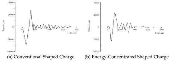 At Point 2 of the two similar model test blocks, a comparison between Figure 8a,b reveals that before 600 μs is the dynamic loading phase of the blasting. During this phase, the coal body is mainly affected by the explosion stress wave, resulting in drastic changes in stress values. Both simulated test blocks showed two stress peaks during this phase. In the simulated test block filled with conventional shaped charges, the strain peak at Point 2 was −26,511 με, while in the simulated test block filled with directional energy-concentrated shaped charges, the strain peak at Point 2 was −32,304 με. It can be calculated that the strain peak in the horizontal energy-concentrating direction using directional energy-concentrated shaped charges is approximately 1.22 times that of conventional shaped charges. During the static loading phase, in Figure 8a, the static loading phase of the model test block filled with conventional shaped charges is from 600 μs to 1200 μs, with a duration of 600 μs. In Figure 8b, the static loading phase of the model test block filled with directional energy-concentrated shaped charges is from 600 μs to 1400 μs, with a duration of 800 μs. This reflects that in the horizontal direction, directional energy-concentrated shaped charges can prolong the duration of detonation gas action, guiding more detonation gases towards the energy-concentrating direction.