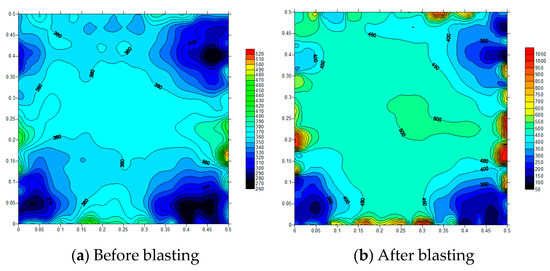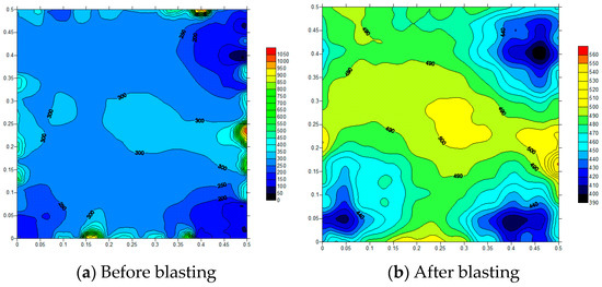 As shown above, where Figure 11a depicts the contour map of resistivity before blasting for the block with ordinary explosive charge, and Figure 11b shows the contour map of resistivity after blasting for the block with ordinary explosive charge. From Figure 11a, it can be observed that the resistivity in most areas is approximately 360 Ω·m, distributed relatively uniformly. From Figure 11b, it can be seen that after blasting, the maximum resistivity at the center position is 500 Ω·m, while the resistivity values around it are approximately 450 Ω·m. Comparing Figure 11a,b, it is evident that after blasting with ordinary explosive charge, a crushed zone appears near the blasting hole. Therefore, the resistivity value at the center position is higher than that of its surroundings. The resistivity at the center position has increased by approximately 140 Ω·m after blasting, representing an increase of approximately 38.9%. The resistivity around the center has increased by approximately 90 Ω·m, representing an increase of approximately 38.9%. There is a slight increase in resistivity in the four corner areas, but the variation is relatively small compared to other positions.