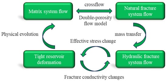 In the process of oil and gas reservoir development, the seepage field and the stress field are a bidirectional coupling process. The seepage of fluids leads to changes in the pore pressure of the formation, resulting in changes in the effective stress on the reservoir rocks and deformation of the rocks. At the same time, the deformation of reservoir rocks also affects the changes in reservoir pore volume, thereby affecting the characteristics of seepage. The elastic theory of porous media and the mechanism of fluid solid coupling are shown in Figure 1. The basic assumptions of this model are as follows: ① The reservoir is composed of a matrix system and a natural fracture system, with a quasi-steady-state flow between the two. ② A porous medium is considered as a fully saturated and isotropic linear elastic body. ③ The reservoir undergoes elastic deformation, satisfying the assumption of small deformation and following the Terzaghi effective stress principle. ④ The isothermal flow of single-phase fluid follows Darcy’s law, ignoring the influence of gravity. ⑤ Crude oil flows from the matrix system through natural fractures toward fractured fractures and wellbore.