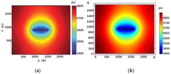 From Figure 15, it can be observed that as the fracture length increases from 80 m to 160 m, the maximum horizontal principal stress at the fracture opening increases by 0.66 MPa, while the minimum horizontal principal stress decreases by 0.13 MPa. The stress variation is within the range of 0.83%. And as production progresses, the change in the length of the main fracture has a relatively small impact on the principal stress and pore pressure. From Figure 16, it can be observed that as the length of the main fracture increases, the stress distribution shape remains unchanged and the range changes. The minimum horizontal principal stress decreases in the high stress area and increases in the low stress area.