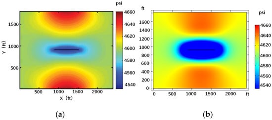 Therefore, many scholars have also calculated and analyzed the stress field from the perspective of theoretical solutions. Currently, there are mainly analytical, semi-analytical, and numerical methods for calculating induced stress fields. Sneddon and Elliott [,] derived analytical models of stress fields around flat fractures and infinitely long fractures and obtained analytical solutions; Palmer [] analyzed the induced stress field generated by first fracturing in coalbed methane reservoirs, proposed that induced stress can induce stress deflection near the fractures, and discussed the effects of fracture morphology and net fracture pressure on reservoir permeability; Zhai [] et al. established a pore elasticity model and obtained its analytical solution, which describes the expression of the relationship between porous elastic stress and horizontal minimum and maximum principal stresses, pore pressure, and wellbore radius. Based on the principle of stress superposition, Li [] simplified the physical quantity relationship of traditional induced stress models, derived a mathematical model of horizontal induced stress difference for multiple fracture superposition, and analyzed the single factor variation law that affects the induced stress difference of fractures. The stress field analytical model established in a two-dimensional plane is simple to calculate, but the analytical formula is derived based on certain assumptions, which has a significant deviation from the actual situation.
