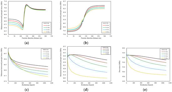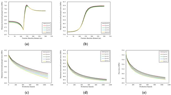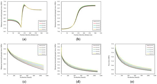 Changes in the influence of different secondary fracture compression coefficients on the horizontal principal stress in the A–A′ direction and the stress at monitoring points. (a) Minimum horizontal principal stress change. (b)Maximum horizontal principal stress change. (c) Monitoring point minimum horizontal principal stress over time curve. (d) Monitoring point maximum horizontal principal stress over time curve. (e) Monitoring point pore pressure over time curve. Where C’f is the compression coefficient of secondary fracture.