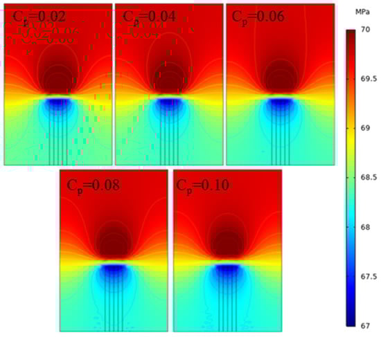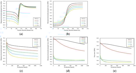 From Figure 6a,b, it can be observed that along the direction of the fracture, the minimum horizontal principal stress shows a decreasing trend in the fracture area, followed by the formation of a stress concentration zone at the tip of the fracture, and finally the formation stress level is restored. The maximum principal stress has been showing an upward trend. As the stress sensitivity coefficient of matrix porosity increases, the minimum horizontal principal stress value in the entire fracture length direction decreases, but the amplitude is small, only 0.27%. The maximum horizontal principal stress increases with the increase in the matrix porosity stress sensitivity coefficient before 120 m (in the fracture area) and reverses after 120 m and decreases with the increase in the matrix porosity stress sensitivity coefficient, with a greater impact than in the fracture area. From Figure 6c–e, it can be seen that both the principal stress and pore pressure show a decreasing trend, with the largest decrease in the early stage of production. As production progresses, the stress curve gradually flattens. After 3 years of production, the maximum horizontal principal stress decreased by 3.19–3.36 MPa, the minimum horizontal principal stress decreased by 1.55–1.64 MPa, and the pore pressure decreased by 7.35–7.61 MPa. Moreover, the larger the stress sensitivity coefficient of the matrix porosity, the greater the stress reduction. From the minimum horizontal principal stress cloud map in Figure 7, it can be observed that as the sensitivity coefficient of matrix porosity increases, the low stress zone spreads from the fracture finger to the fracture root, while the range of the high stress zone at the tip decreases, and the stress distribution shape remains unchanged. With the increase in the porosity sensitivity coefficient, the stability of cracks in rocks decreases, and cracks are more likely to expand under lower stress conditions. The spread of the crack will lead to the redistribution of the stress around it, but this redistribution will not change the overall shape of the stress field; it will only change the distribution of the stress.
