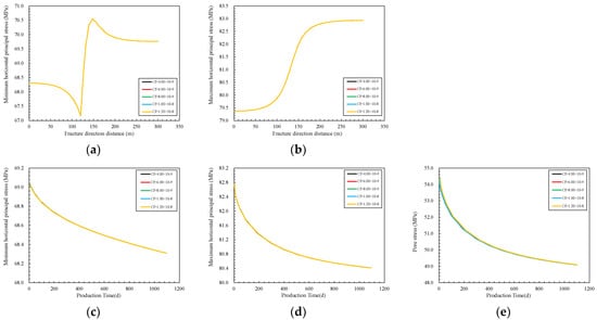 From Figure 8, it can be observed that along the direction of the fracture, as the stress sensitivity coefficient of the matrix permeability increases, the minimum horizontal principal stress shows an increasing trend, while the maximum horizontal principal stress first decreases and then increases. The impact trend is opposite to the stress sensitivity coefficient of the matrix porosity. The opposite reason is that with the increase in the stress sensitivity coefficient of matrix porosity, the matrix porosity will decrease, and the amount of oil and gas resources per unit space will be less. With the production progress, the stress sweep range will increase, resulting in a faster stress drop. With the increase in the matrix permeability stress sensitivity coefficient, matrix permeability will decrease; when the fluid flow is slower, and with the progress of production, the stress sweep range will decrease, resulting in a slower and lower stress drop. Within the entire region, the stress variation is within the range of 0.27%, and the degree of influence is similar to the stress sensitivity coefficient of matrix porosity. After 3 years of production, the stress reduction in the minimum principal stress was relatively small. Within 1.53–1.72 MPa, the maximum horizontal principal stress decreased by 3.19–3.36 MPa, and the pore pressure decreased by 7.31–7.75 MPa. Overall, the sensitivity coefficient of matrix permeability has a greater impact on pore pressure and a minimum impact on the maximum horizontal principal stress.