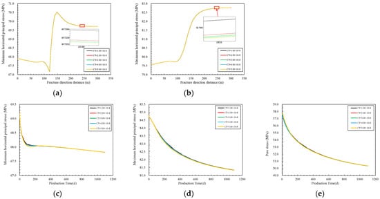 From Figure 13a,b, it can be seen that as the spacing between main fractures increases from 8 m to 16 m, the minimum horizontal principal stress near the wellbore decreases by 0.92MPa, and the maximum horizontal principal stress increases by 0.43 MPa, with a variation range of 1.36%. From Figure 13c–e, it can also be seen that as the spacing between main fractures increases, the decrease in principal stress and pore pressure increases. From pressure cloud map 14, it can be observed that after 3 years of production, as the fracture spacing increases, the low stress zone spreads from the fracture tip to the surrounding areas, and the high stress changes from a circular area to a semi-circular area (Figure 14).