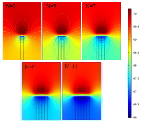 From Figure 11a,b, it can be observed that as the number of main fractures increases from 3 to 11, the minimum horizontal principal stress in the fracture area decreases by 1.9 MPa, and the maximum horizontal principal stress increases by 0.64 MPa, with a variation within the range of 2.85%. From Figure 11c–e, it can be seen that as production progresses, the change in the number of fractures has the greatest impact on pore pressure and the smallest impact on minimum principal stress. After the production of 300, the main stress tends to flatten under different fracture numbers, and the pore pressure only tends to flatten after the number of fractures is greater than 9, while the number of fractures is fewer than 9. As production progresses, the pore pressure shows a decreasing trend. From the pressure cloud map 9, it can be observed that after 3 years of production, as the number of main fractures increases, the diffusion range of the low stress area of the minimum horizontal principal stress significantly expands, changing from a semi-circular distribution to a volcanic crater-shaped distribution, and the high stress area at the fracture tip changes from an elliptical distribution to a semi-circular distribution (Figure 12).