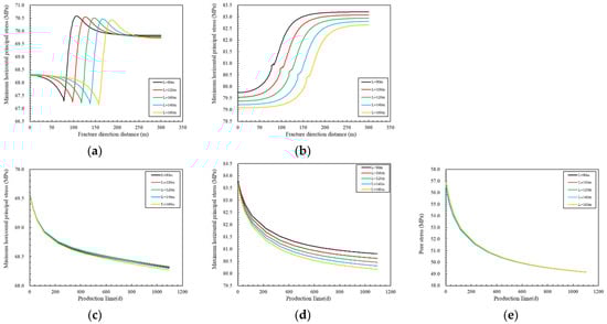 Changes in the influence of different main fracture lengths on the horizontal principal stress in the A–A′ direction and the stress at monitoring points. (a) Minimum horizontal principal stress change. (b) Maximum horizontal principal stress change. (c) Monitoring point minimum horizontal principal stress over time curve. (d) Monitoring point maximum horizontal principal stress over time curve. (e) Monitoring point pore pressure over time curve. Where L is the main fracture length.