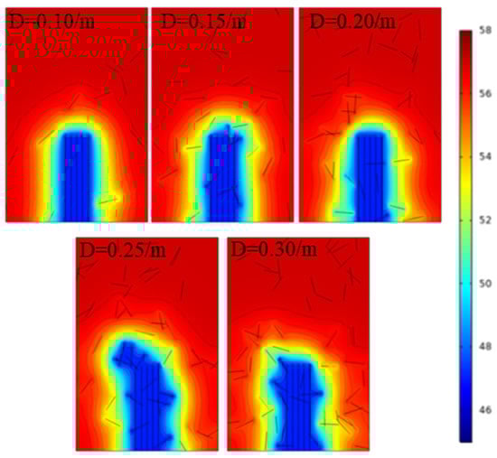 In order to investigate the influence of natural fracture density on pressure channeling, the distribution of pore pressure cloud maps under different natural fracture densities was plotted, as shown in Figure 17. From Figure 17 and Figure 18, it can be seen that as the density of natural fractures increases from 0.1 to 0.3, the pore pressure decreases by 1.59 MPa (3.32%), the gradient significantly increases, and the diffusion range of pore pressure significantly expands. In most cases, the higher the density of natural fractures, the larger the reservoir area where the fractures communicate. However, when the density of natural fractures increased from 0.25 to 0.3, the results of the quantitative analysis of the blue area by software show that the difference of the diffusion range between the two is only 0.5%, and there is no obvious change. It can be seen that most natural fractures did not successfully open or their permeability was too low. Therefore, when fracturing multiple clusters of horizontal wells, it is necessary to avoid communicating with natural fracture zones or consider reducing the flow conductivity of natural fractures.