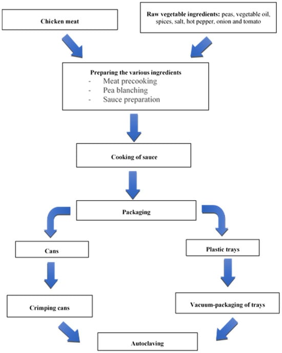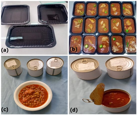 This study is interested in canned pea sauce (a traditional Tunisian dish) which typically consists of a blend of cooked peas, onions, garlic, and olive oil, seasoned with a combination of herbs and spices such as parsley, cumin, and paprika. The manufacturer optimized and validated this dish’s recipe in previous studies (under publication processing). The sauce, peas, and pre-cooked meat were packaged in plastic trays, sealed using a Multivac T 200 tray sealer (Oakaville, ON, Canada), or in metal cans crimped using a Automatic Can Seamer ROBOT 80 JK Somme (Borgos, Spain), and sterilized in a “Surdry” horizontal static autoclave (Bizkaia, Spain), (Figure 1 and Figure 2). The capacity of the 2 types of packaging was 400 g and the filling rate was 87.5% for the cans and it varied from 50% to 100% for the plastic trays.