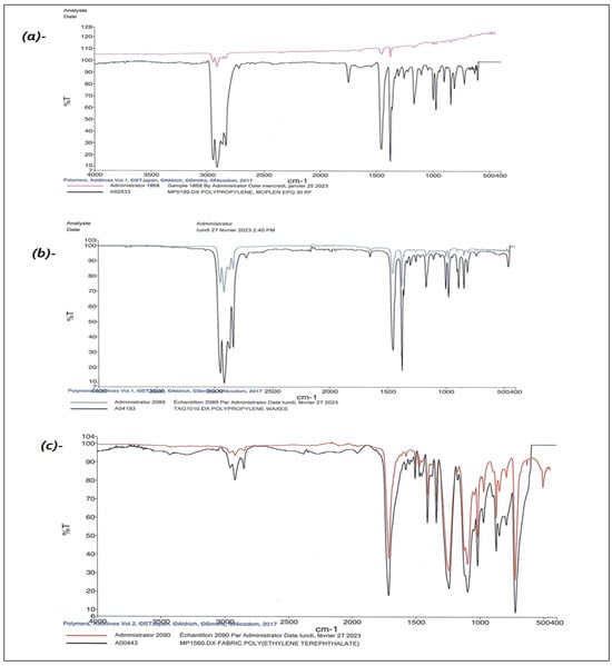 Thus, spectral analysis identified characteristic peaks in the tray and internal film at 1378 cm−1 and 2948 cm−1, respectively. These values strongly resemble the reference spectrum of polypropylene (PP), particularly corresponding to the CH3 (methyl group) and CH2 (methylene group) functional groups prevalent in its structure. In contrast, the external film exhibited a unique spectral signature with prominent peaks at 1715 cm−1 and 1405 cm−1. These values are highly indicative of polyethylene terephthalate (PET), as they correspond to the characteristic carbonyl group (C=O) and aromatic ring stretching vibrations within its chemical structure. Consequently, the plastic tray was solely composed of PP, while the film demonstrated a heterogeneous composition of PP internally and PET externally. This underscores FTIR spectroscopy’s capability in accurately characterizing polymer compositions.