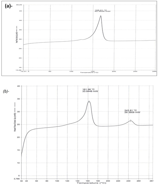 The Differential Scanning Calorimetry (DSC) analysis in this study enabled the identification of plastics in the tray and film by revealing characteristic melting points. Results showed a single endothermic peak at 168 °C in the plastic tray’s thermogram, indicating the presence of the polypropylene (PP) polymer. In contrast, the plastic film exhibited two endothermic peaks: the first at 161.96 °C, corresponding to PP, and the second at 243.81 °C, corresponding to the PET polymer (Figure 4). These findings aligned with the FTIR results, confirming that the plastic tray comprised solely PP, whereas the film comprised PP internally and PET externally. These melting temperature findings of both the plastic tray (168 °C ) and the internal face of the cover film (161.96 °C) were consistent with previous research reporting melting temperatures for neat PP at various ranges, extending from 160 °C to 172.2 °C [3,27]. The semi-crystalline nature of PP and its melting point, usually around 165 °C, were highlighted, despite its limitations in high-temperature settings. However, PP’s prevalence in food packaging persists due to its accessibility and suitability [28].