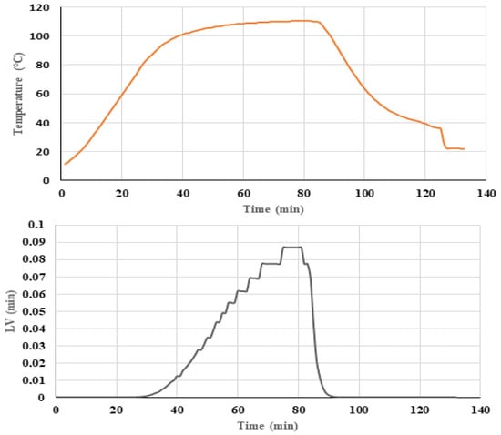 - The effectiveness of the heat treatment is evaluated through the comparison calculated as the area under the Lv curve [18], according to Equation (2):Lv = 10((T − 121)/Z),