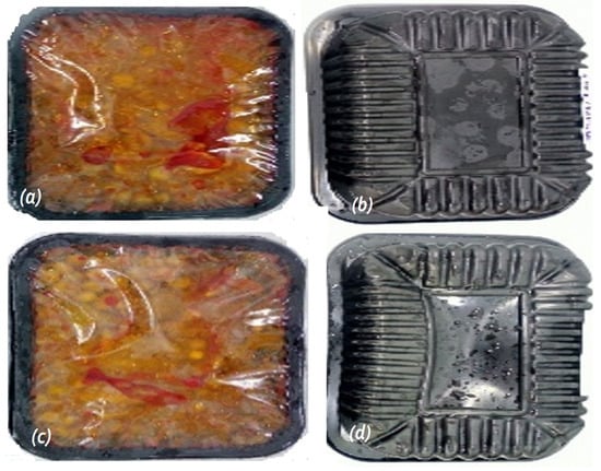 Aspects of the intact (a,b) and deformed (c,d) packaging of the used plastic trays.