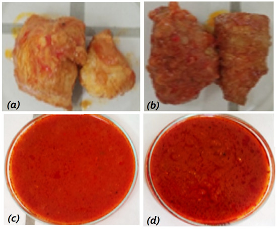 Aspects of meat appearance (a,b) and sauce color (c,d) after 28 days of storage in cans and plastic trays, respectively.
