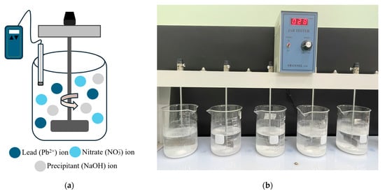 Batch experiments of chemical precipitation were conducted through jar tests at different pH levels of 6.0, 7.0, 8.0, 9.0, and 10.0, lead nitrate concentrations of 0.05, 0.07, 0.09, 0.11, and 0.13 M, and molar ratios of 0.5, 1.0, 1.5, 2.0, and 2.5 [13,14,15]. Figure 1 shows the experimental setup for this study. All the experimental runs were carried out at room temperature (25 °C). Lead nitrate and sodium hydroxide were used as the simulated wastewater and hydroxide precipitant, respectively, to determine the lead and nitrate removal efficiency. The mixtures were stirred at a speed of 100 revolutions per min (rpm) for a duration of 10 min, followed by a reduced speed of 30 rpm for 50 min, as described in the referenced literature [16]. Subsequently, the mixtures were left to settle for 12 h to draw liquid samples for residual lead and nitrate analysis. For the lead and nitrate residue, the supernatant liquid was filtered with a 0.45 μm syringe filter and digested with 50 μL H2SO4 to terminate precipitation [17].